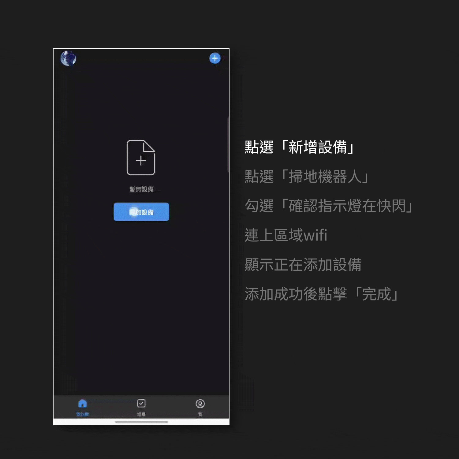 - APP回充:機器在清掃過程中,按APP回充按鍵,機器開始回充,尋找集塵桶。