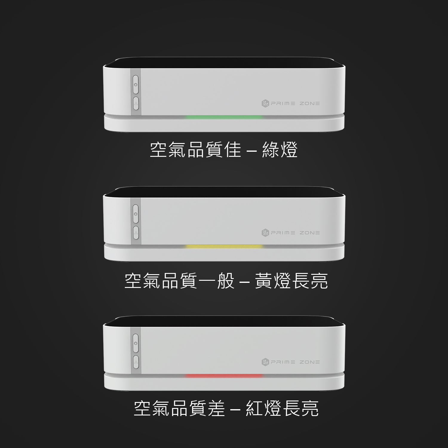 強檔: 風量強+等離子持續運作+光觸媒開啟;三段白燈,長亮5秒後重新顯示空氣品質燈號;