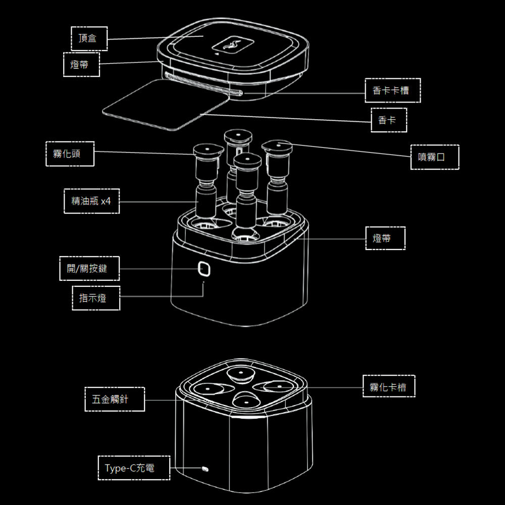 5. 噴霧口使用注意:本產品僅限擴香用途,請勿直接對著噴霧口吸入,亦勿堵住噴霧口,避免造成危險或損壞設備。