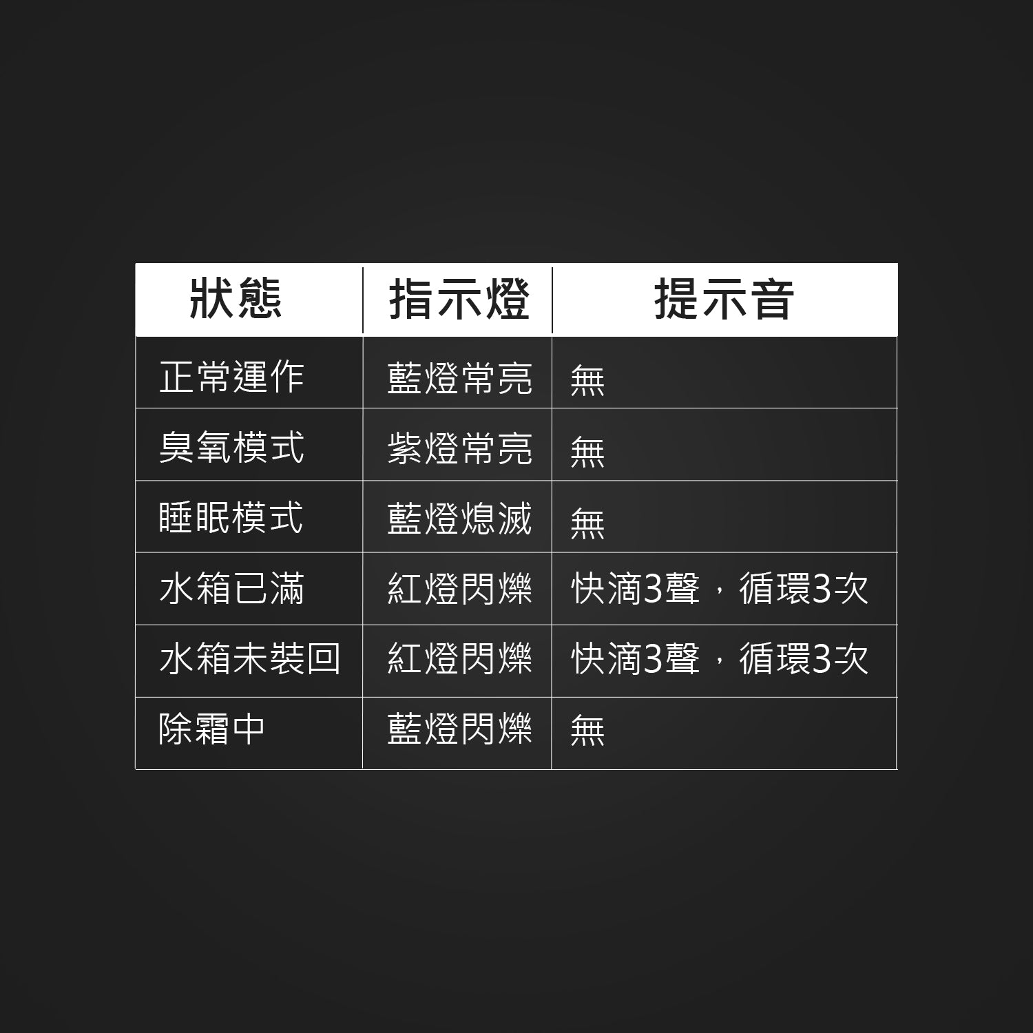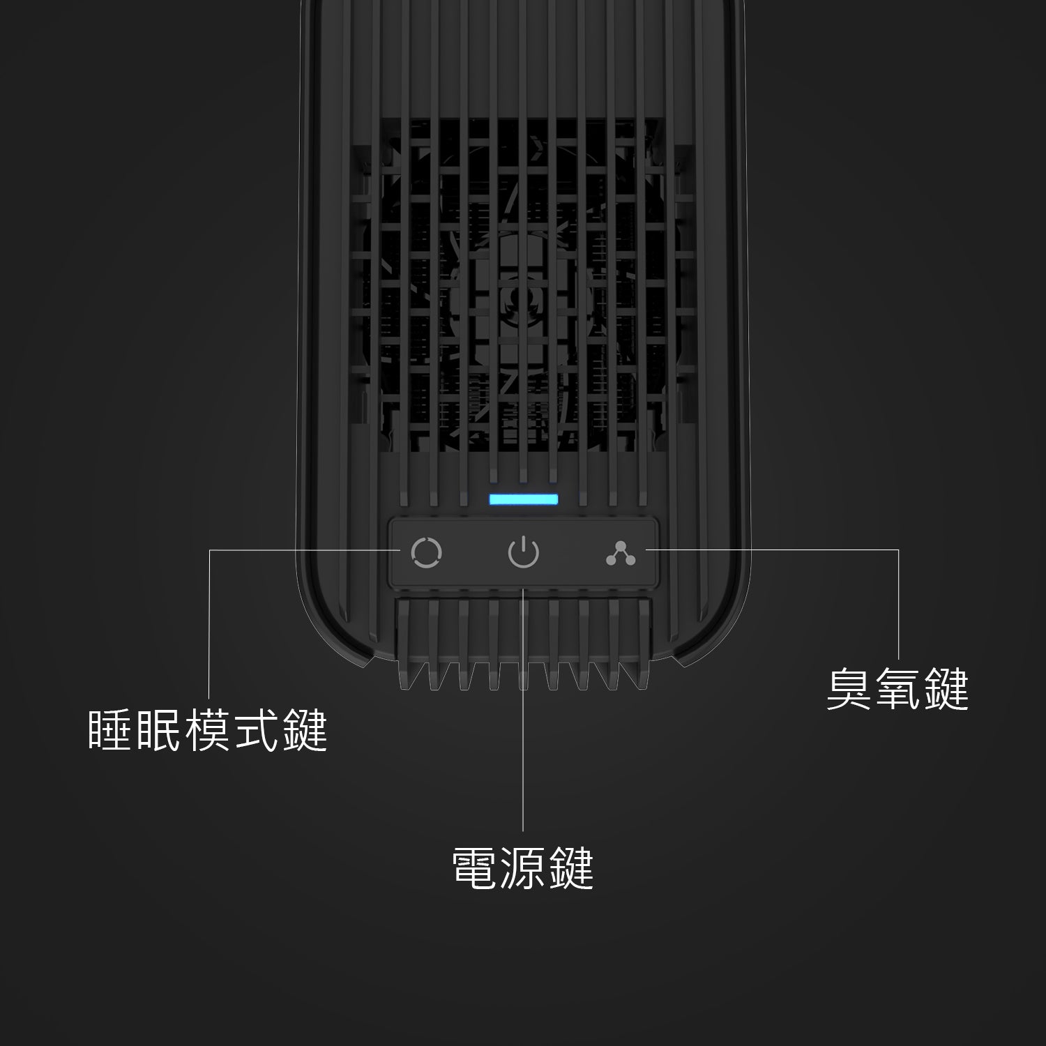 - 操控面板:觸控式按鍵,包含電源鍵、模式鍵、臭氧鍵。
