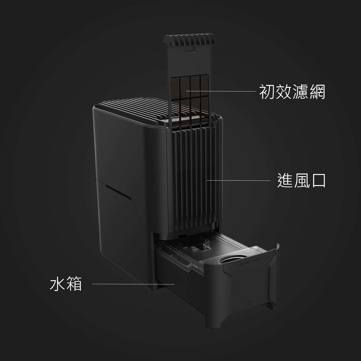 - 濾網清潔:定期(約每2週)將進風口濾網向上推動取出,以清水沖洗並完全晾乾後裝回,以維持除濕效率。