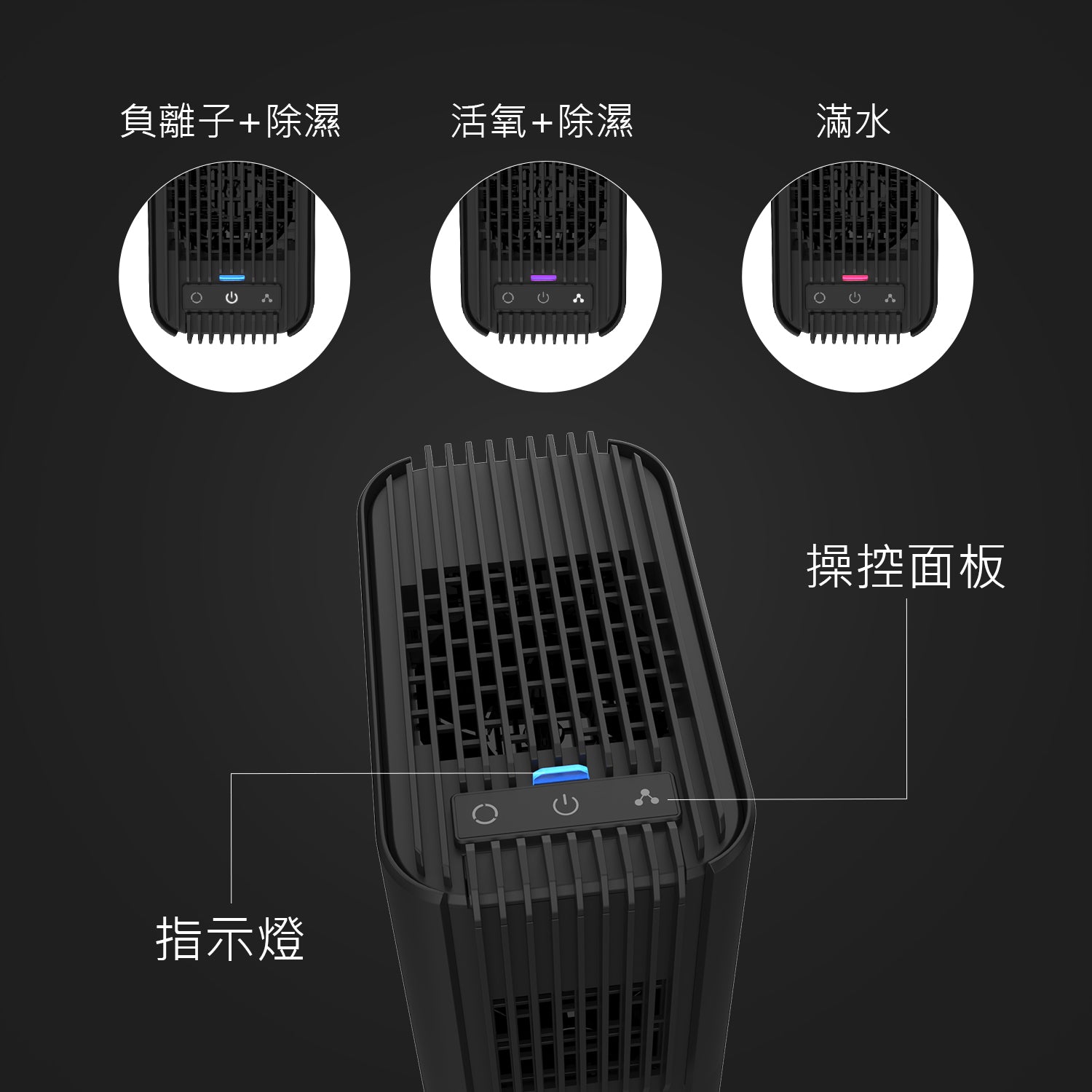 - 開機/關機:短按「電源鍵」。開機後,除濕與負離子功能自動啟動,指示燈藍燈亮起、電源鍵背光亮起。
