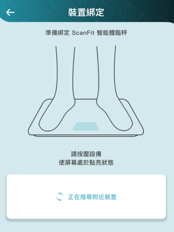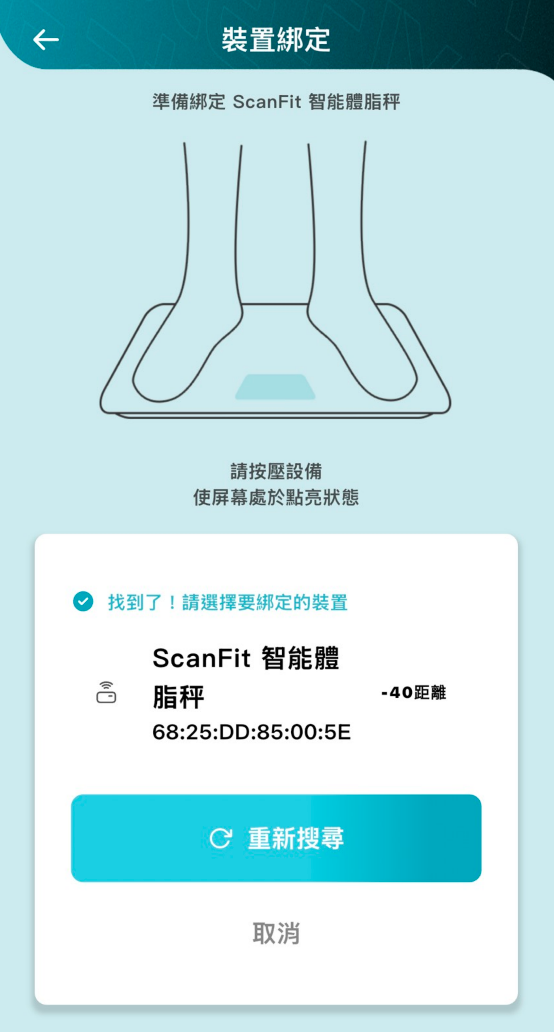 進入「裝置綁定」頁面,在「新發現設備」欄中點擊智能體指秤產品後點擊配對,即可完成連接。