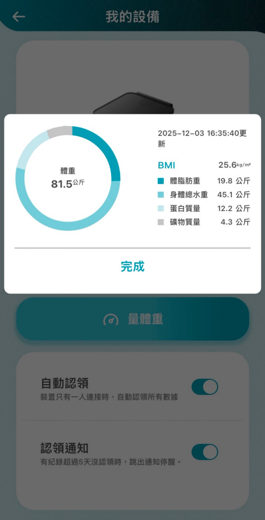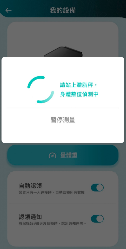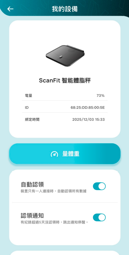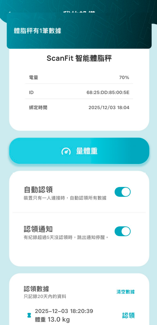 下次您開啟 App 並點擊「量體重」進行量測時,體脂秤會將先前未同步的歷史紀錄一併傳送到 App,並顯示在「認領區」,讓您自行選擇是否要認領到個人帳戶