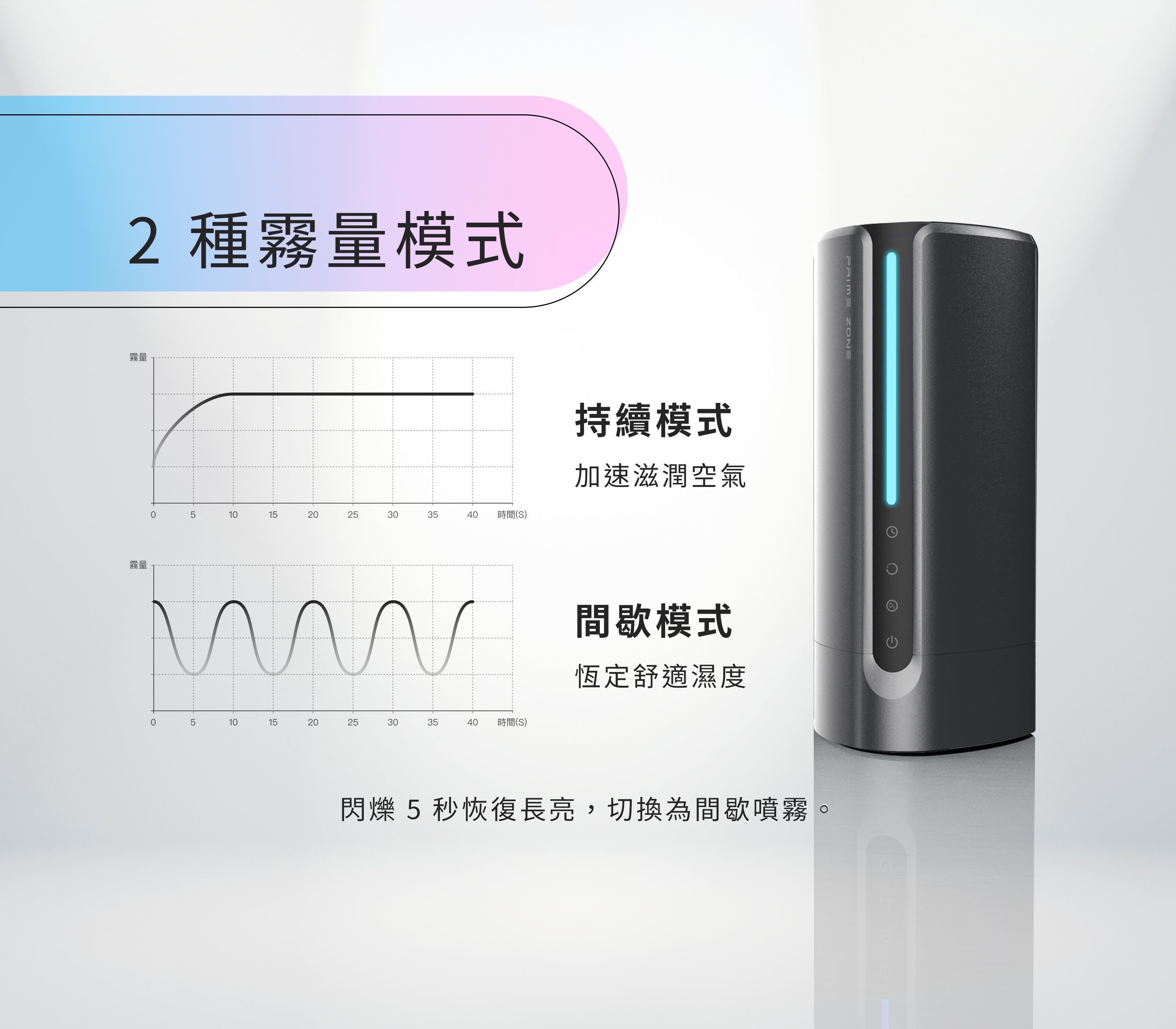 霧化奈米水分子可以有效增加空氣濕度,避免在冷氣或暖氣房內長時間停留時出現肌膚乾裂脫皮和呼吸道不適感,讓身體更自在舒適。