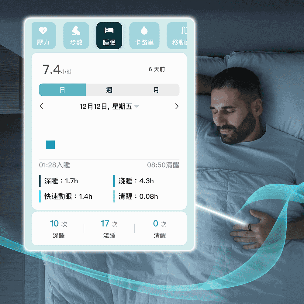 晚間全程掌握睡眠狀態,包含入睡時長、深淺睡比例、清醒次數。可請AI Chatbot 深度分析,幫助使用者建立更健康的睡眠改善建議。