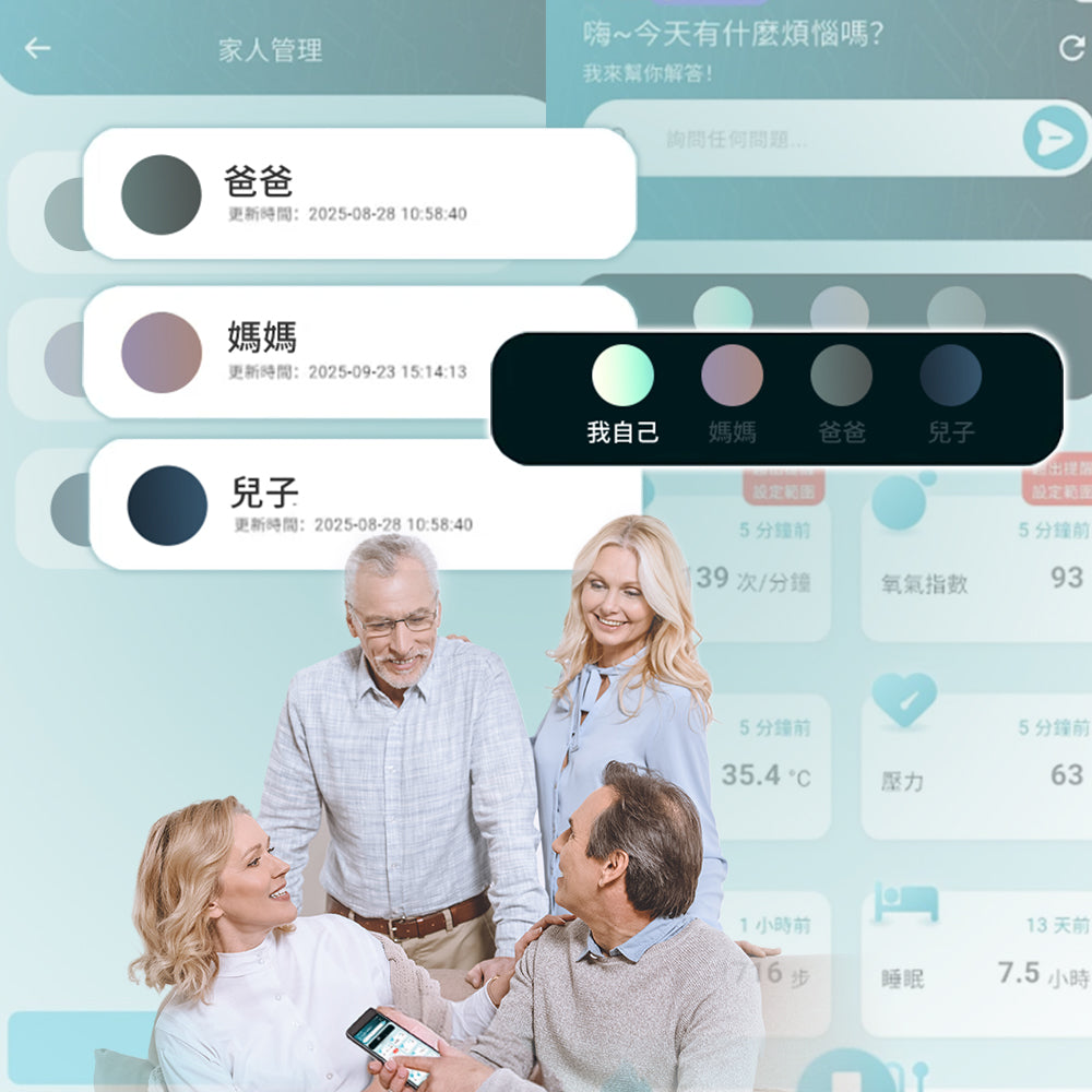 支援多位家人加入,長輩與孩童各種指標即時掌握,App有指標異常即時通知,讓你遠端也能放心。