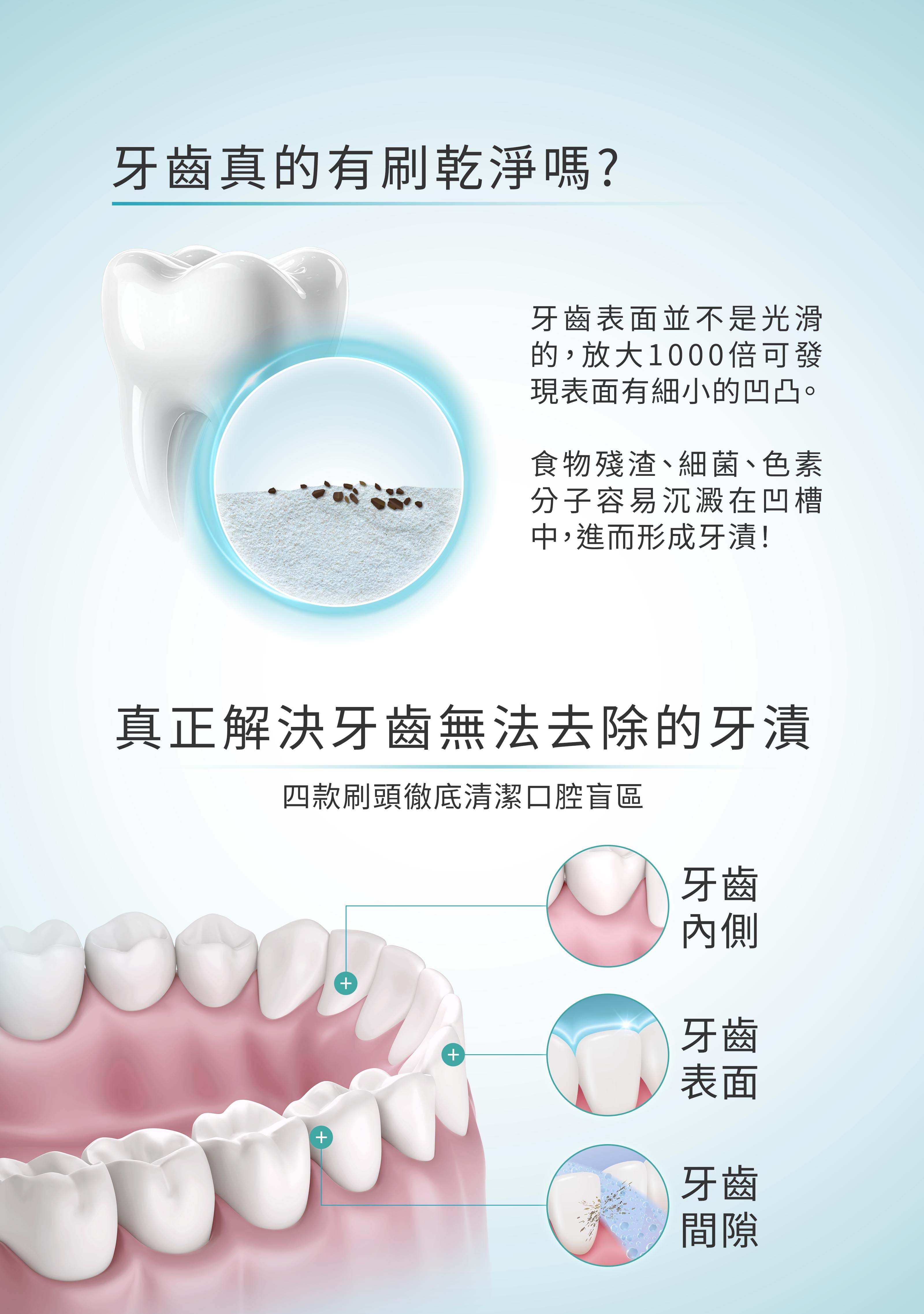 日常大面積清潔,柔軟刷毛不傷齒面、牙齦