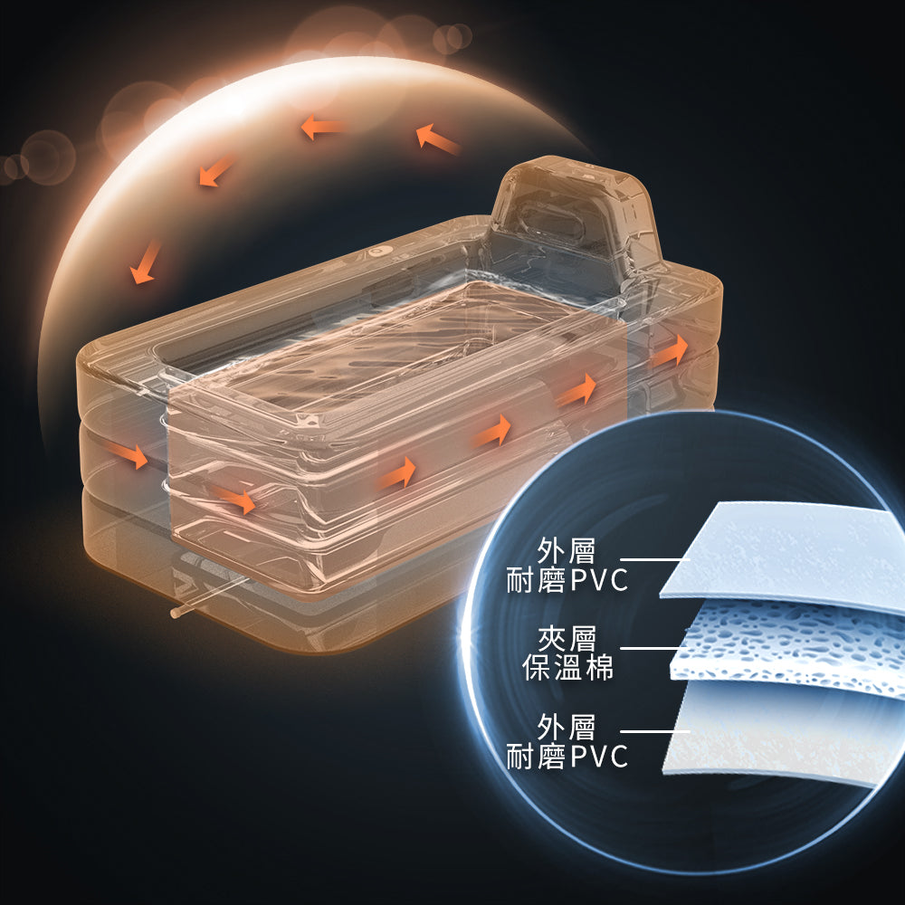 3層加厚設計幫助保溫更持久、防漏更安心。外層PVC材質堅實強韌、耐磨防刮,加固穩定不怕傾倒;內部夾棉柔軟舒適、加強鎖溫,隔絕地面溫度。