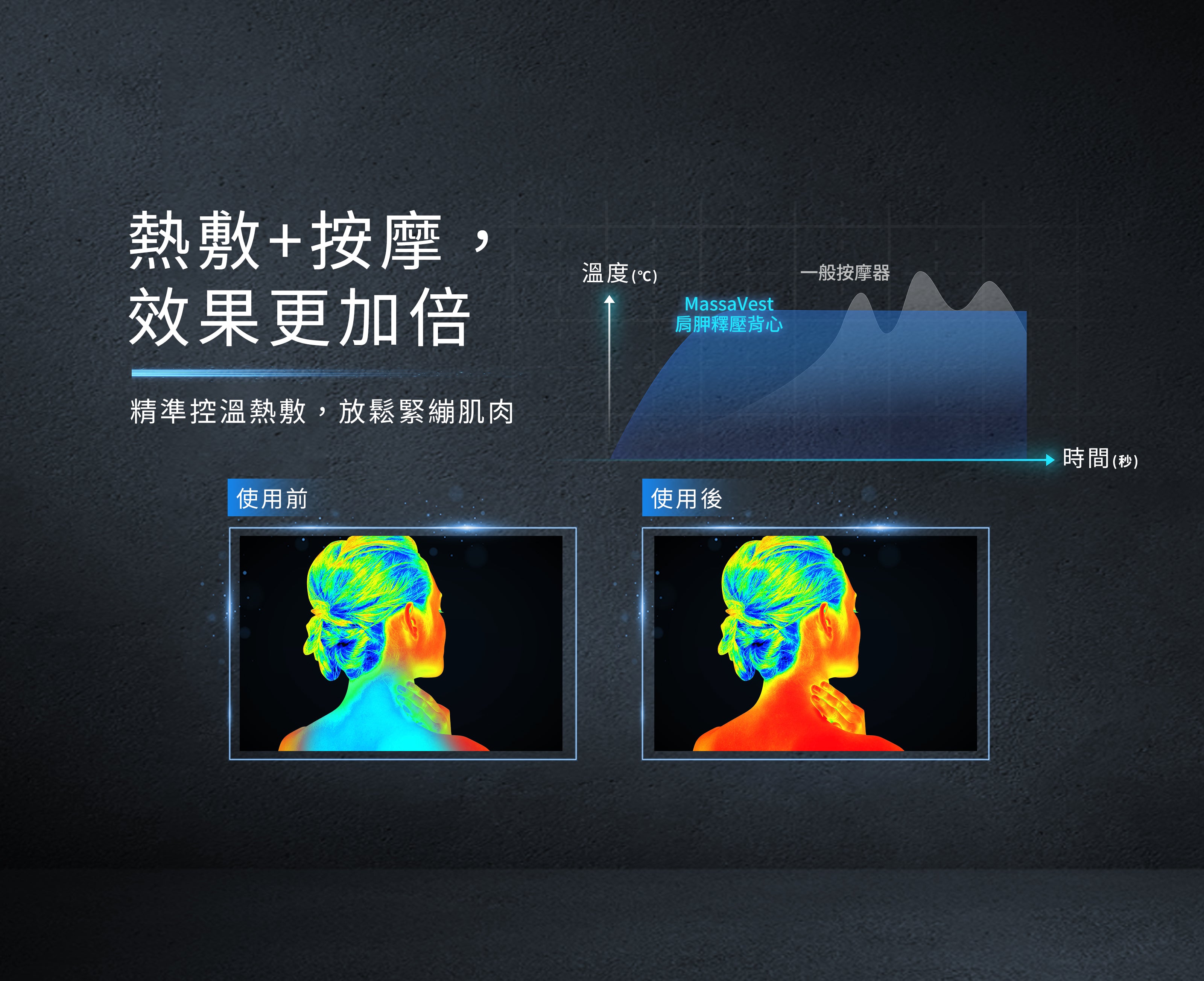 發熱快且溫度穩定,兩段溫度(40°/50°)自由選擇,按摩同時緩解緊繃神經,如SPA溫暖全身心。
