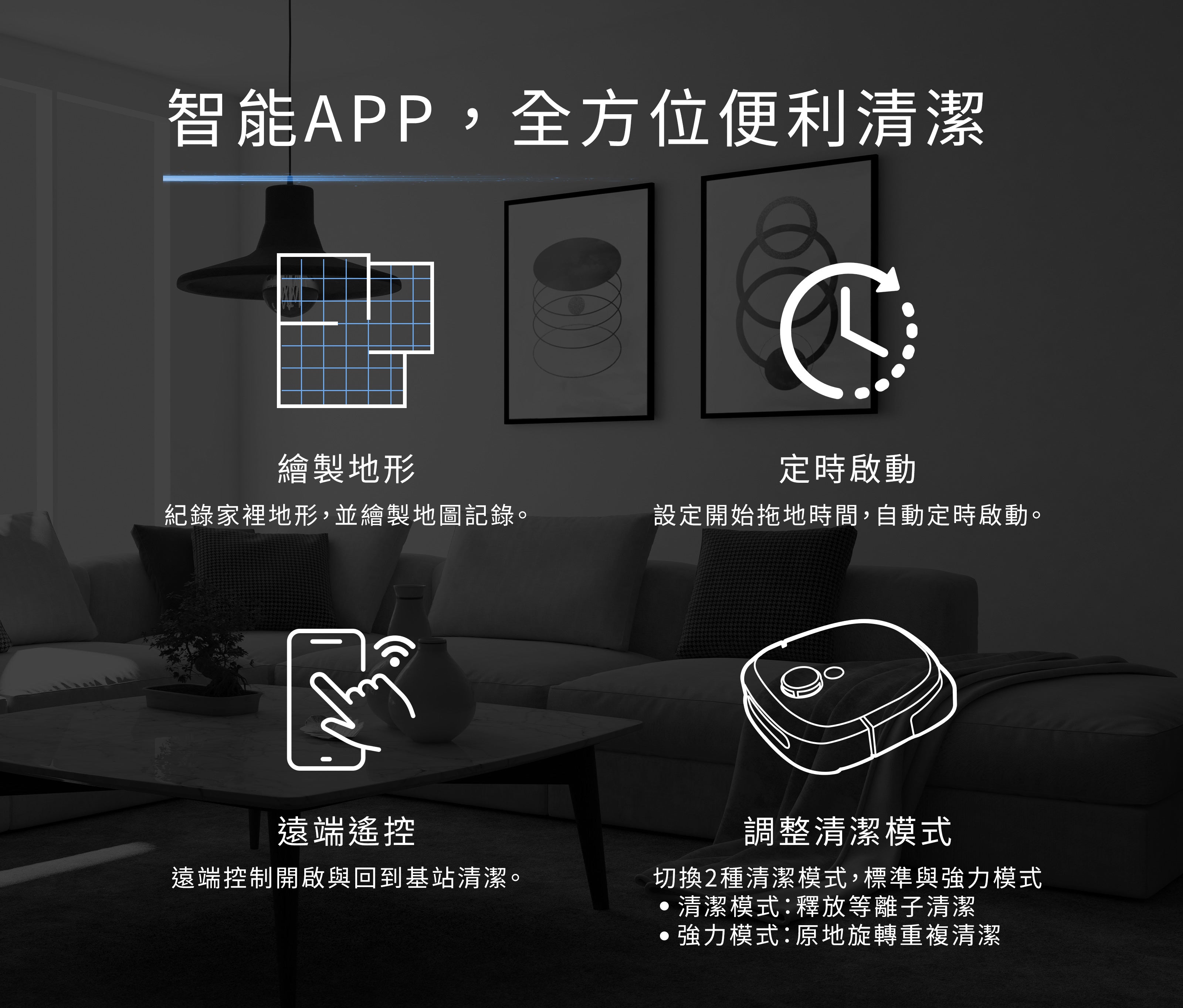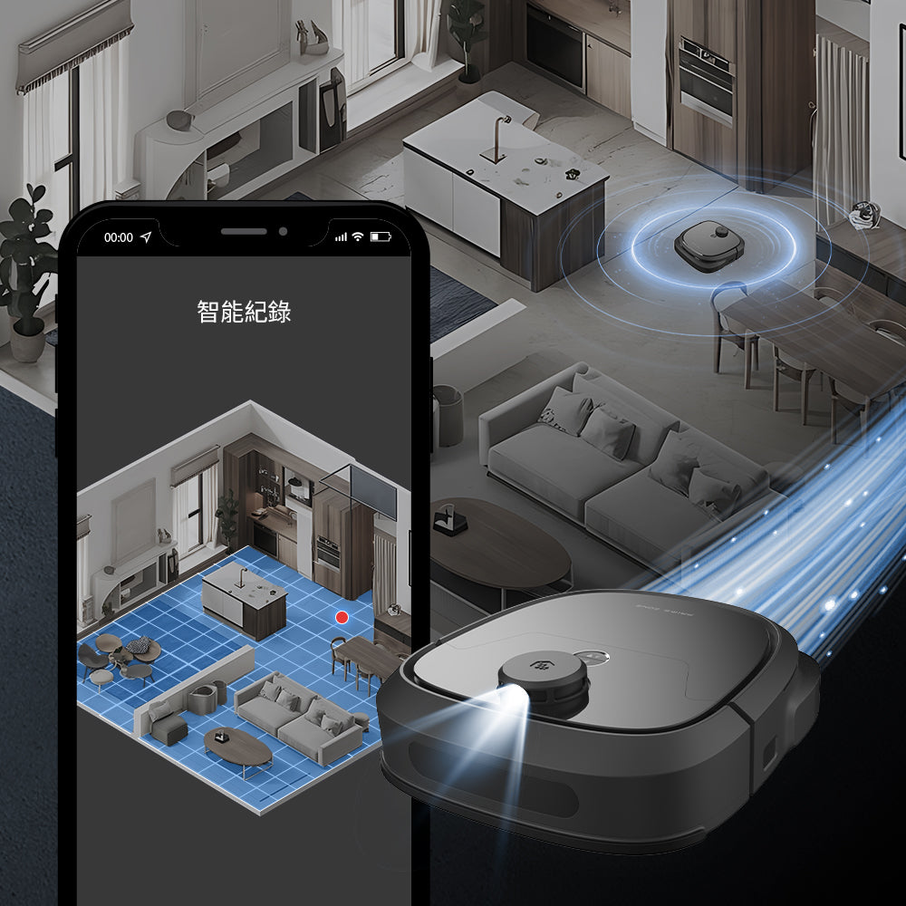 APP智能紀錄與設定,感測器自動偵測,精確繪製地圖並紀錄,遠端遙控清掃,可以紀錄清掃面積與時間。