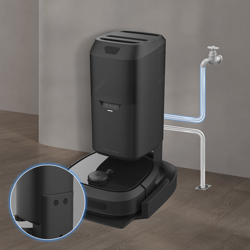 基站配有自動上下水功能,接上管子後具備自動補清水、排出污水,無需手動處理,不需花時間,可以自動幫你更換髒水,打掃更智能方便。