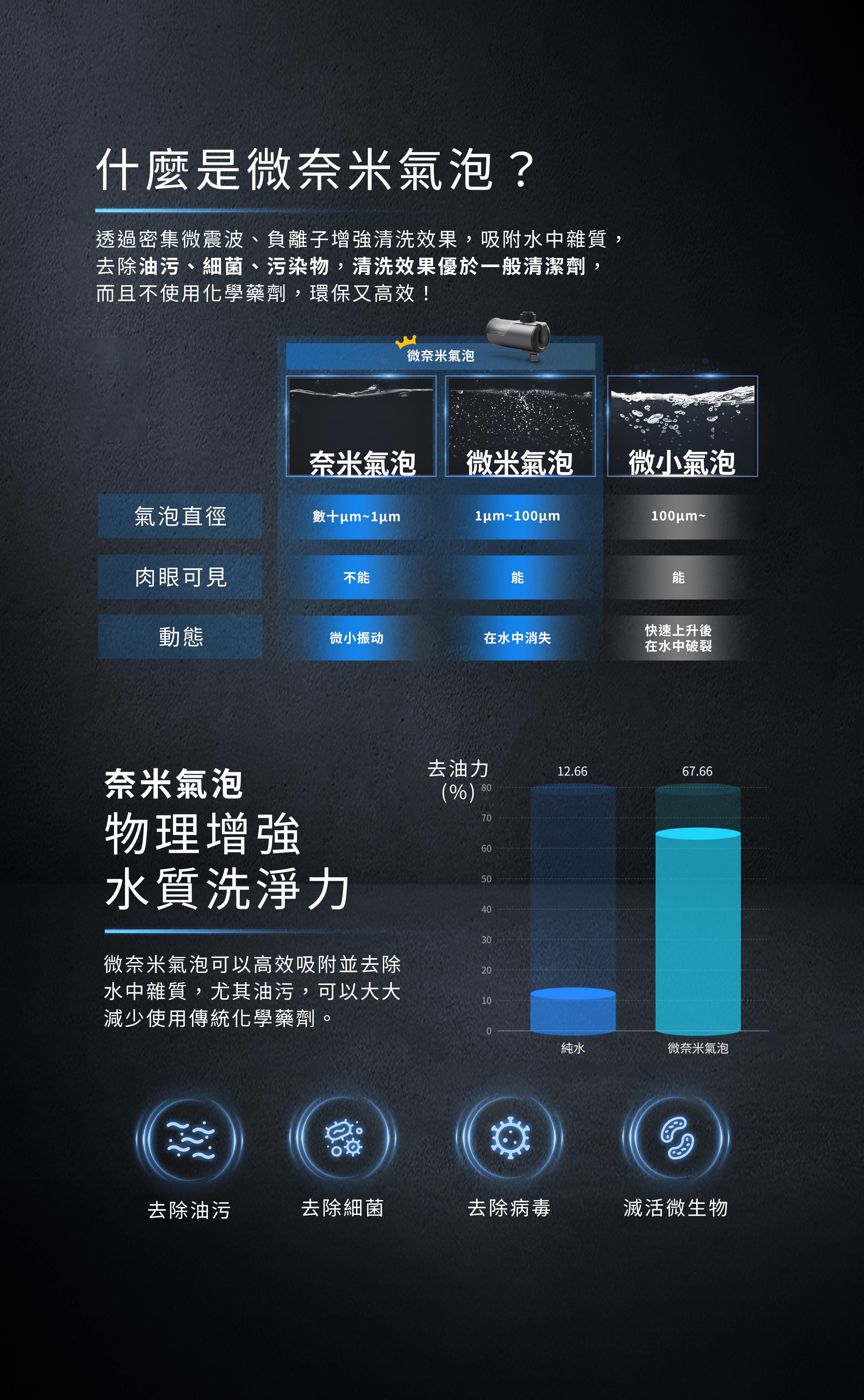 - 淨水模式:透過濾芯與微奈米氣泡過濾,濾淨過的水