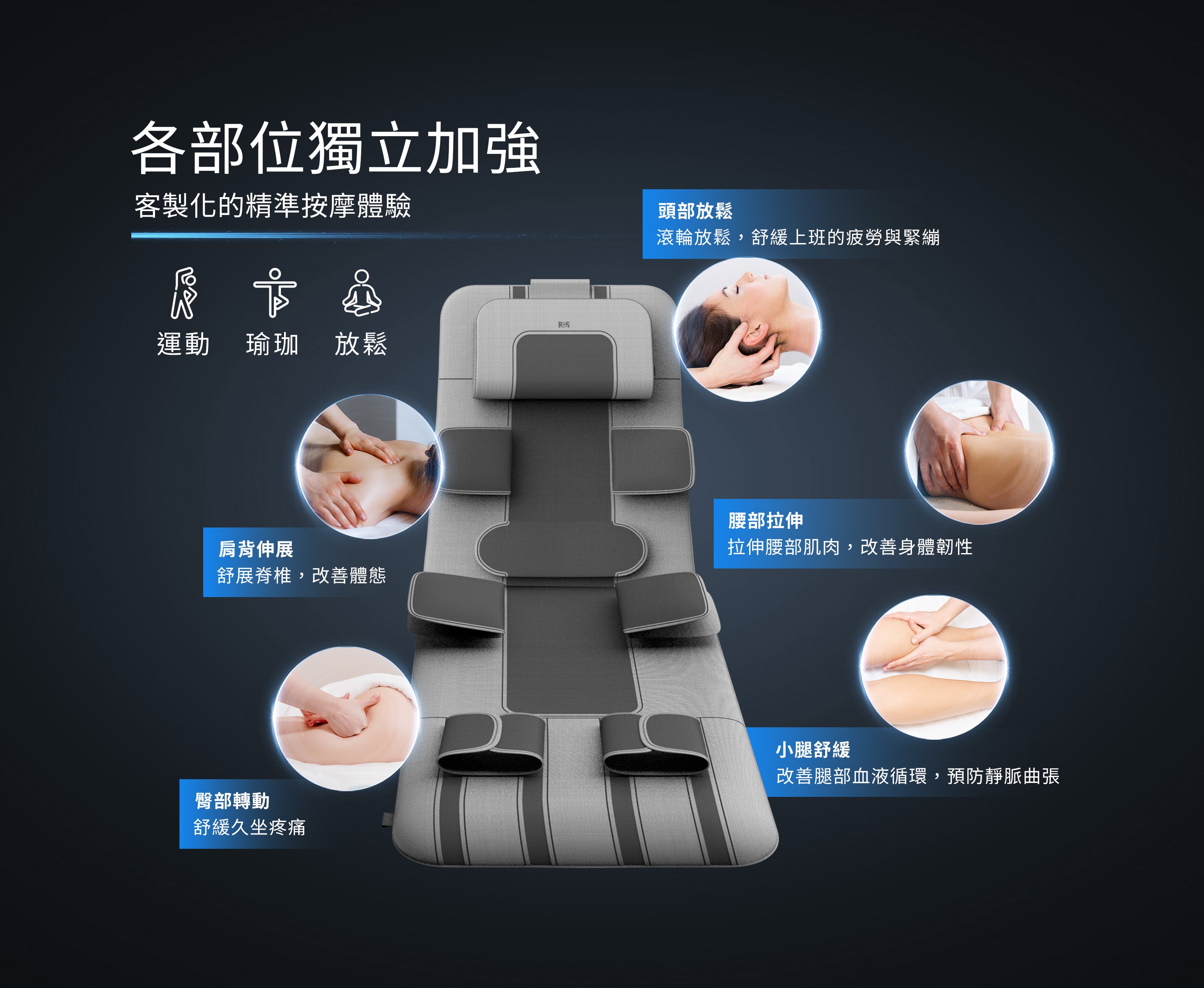 放鬆模式適用於下班後或者運動完畢後, 10個氣囊、6個按摩部位、12個按摩點,為市售最多按摩點的按摩墊,全方位無死角舒緩你全身的肌肉與筋骨,有效緩解肌肉疲勞,給你泰式推拿般的極致享受。