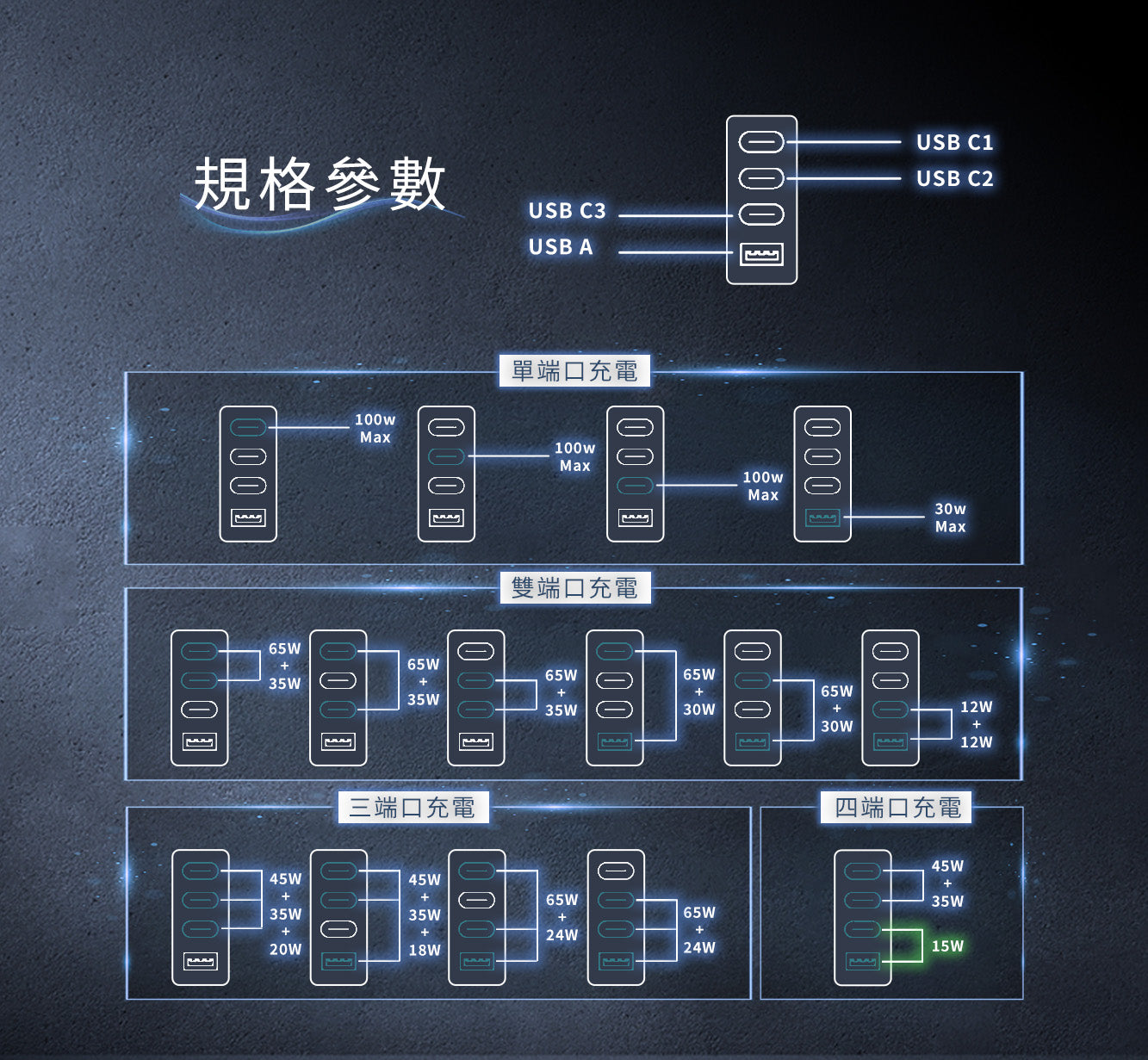 USB-C1/C2/C3 : 5V=3A/9V=3A/12V=3A/15V=3A/20V=5A