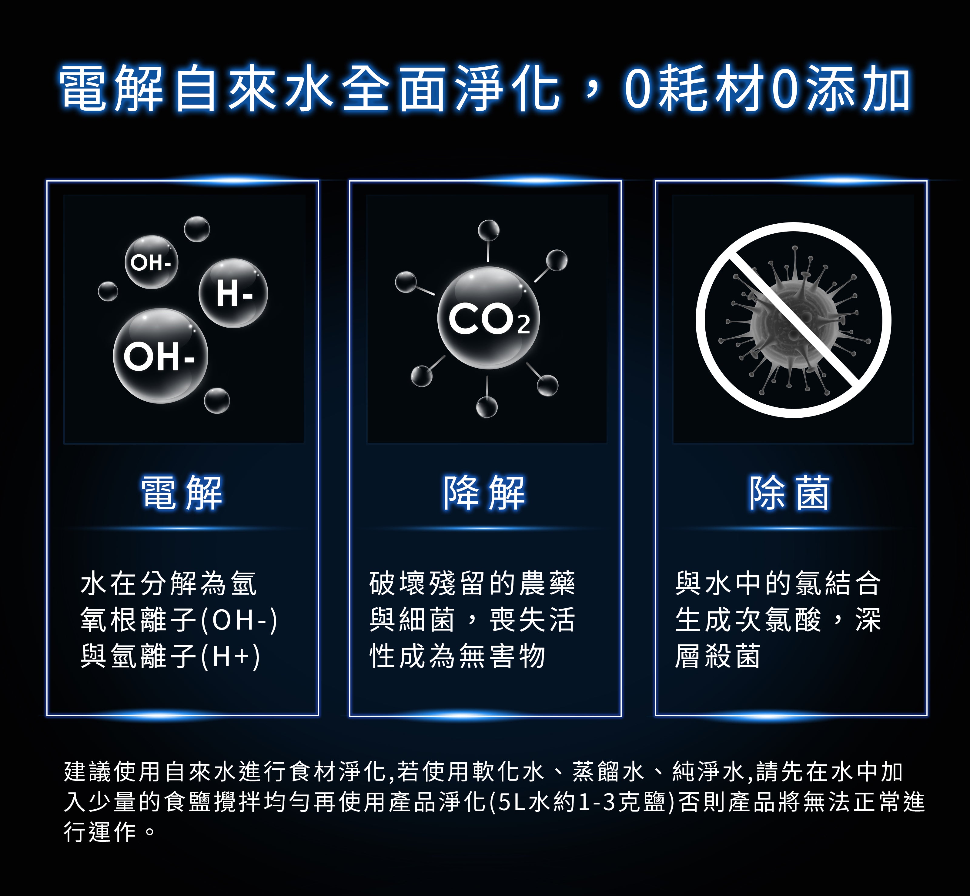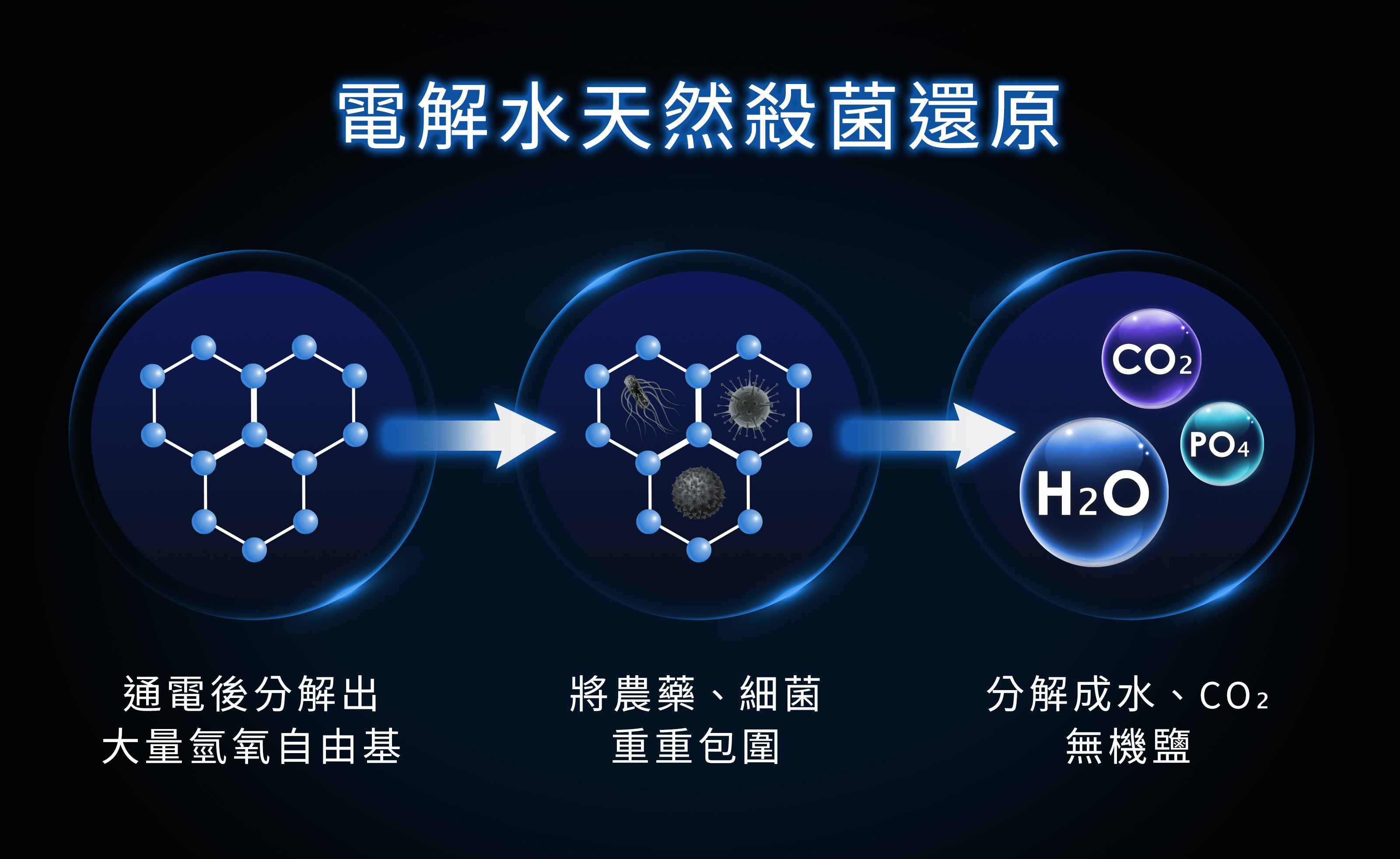 市售蔬果多有農藥殘留,透過水中氫離子(H+)與氫氧離子(OH-)全面帶出,不必費力刷洗,水裏泡一泡清潔有效率。
