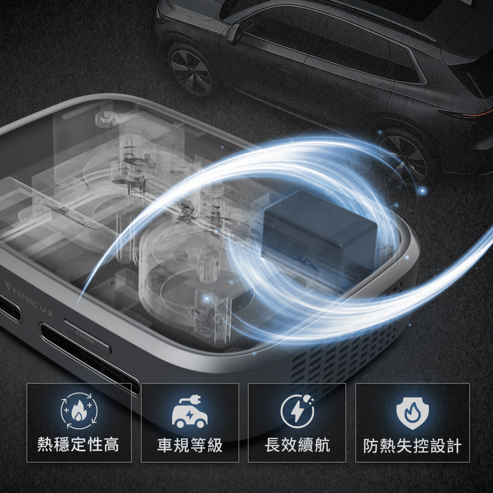 採用與電動車相同等級的「磷酸鐵鋰電池」,具備高穩定、耐高溫等特性,提升車內長時間使用的安全性與續航力。