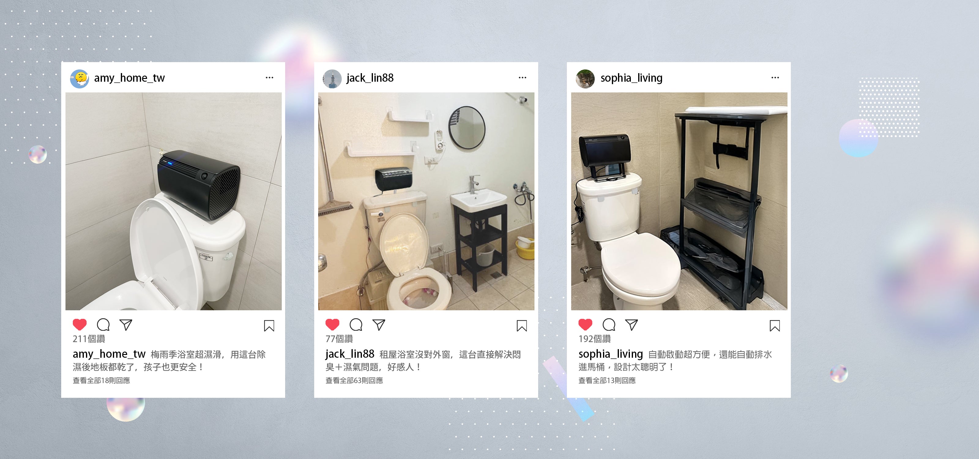 針對台灣濕熱的氣候與狹小衛浴空間,團隊反覆測試,研發出能同時淨化空氣與除濕的多合一設備,強調智慧感應與空間效率。