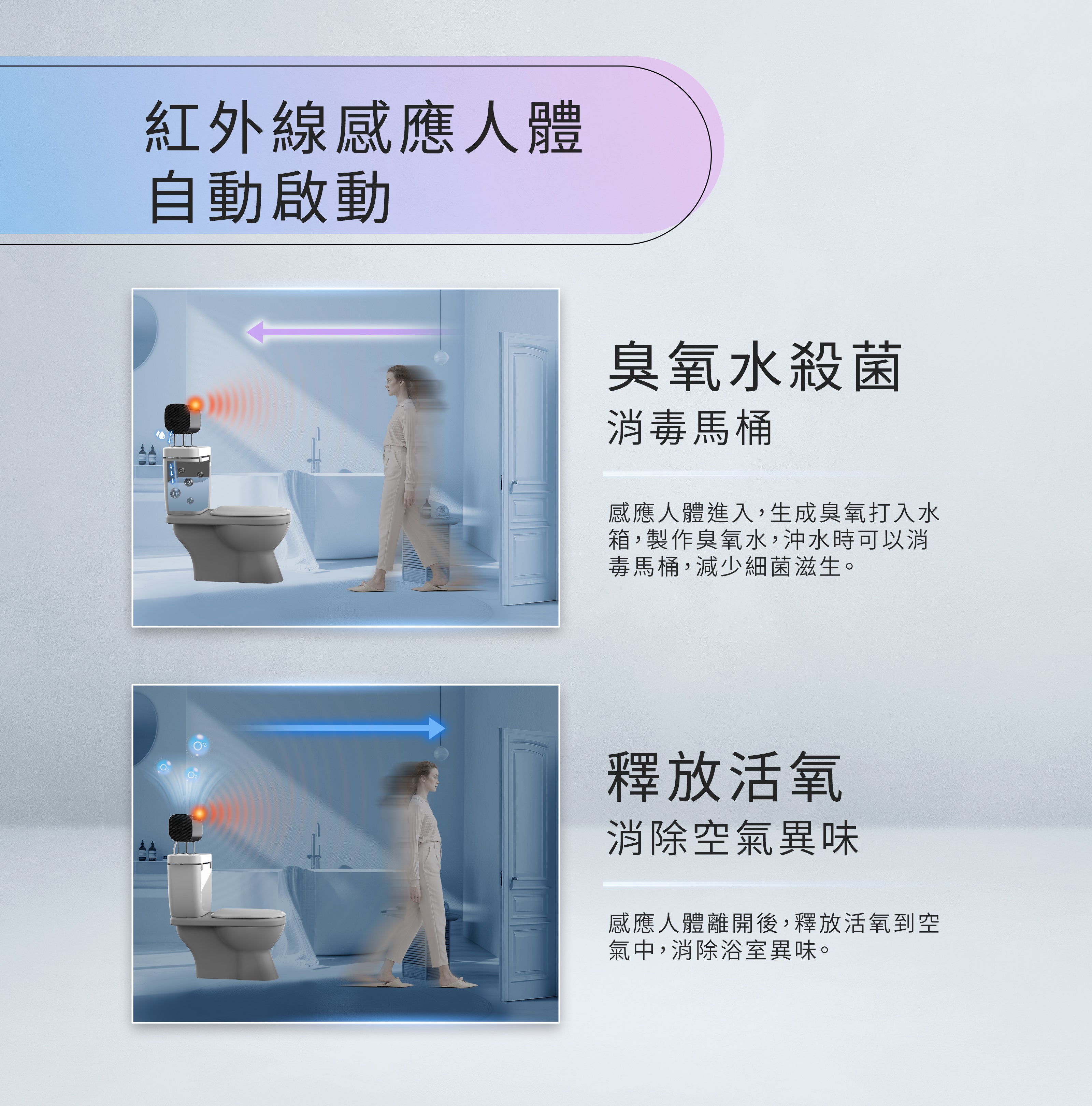 - 如廁時:紅外線感應人靠近時,會自動製作臭氧水打入馬桶水箱,沖水時殺菌消毒馬桶,避免細菌滋生