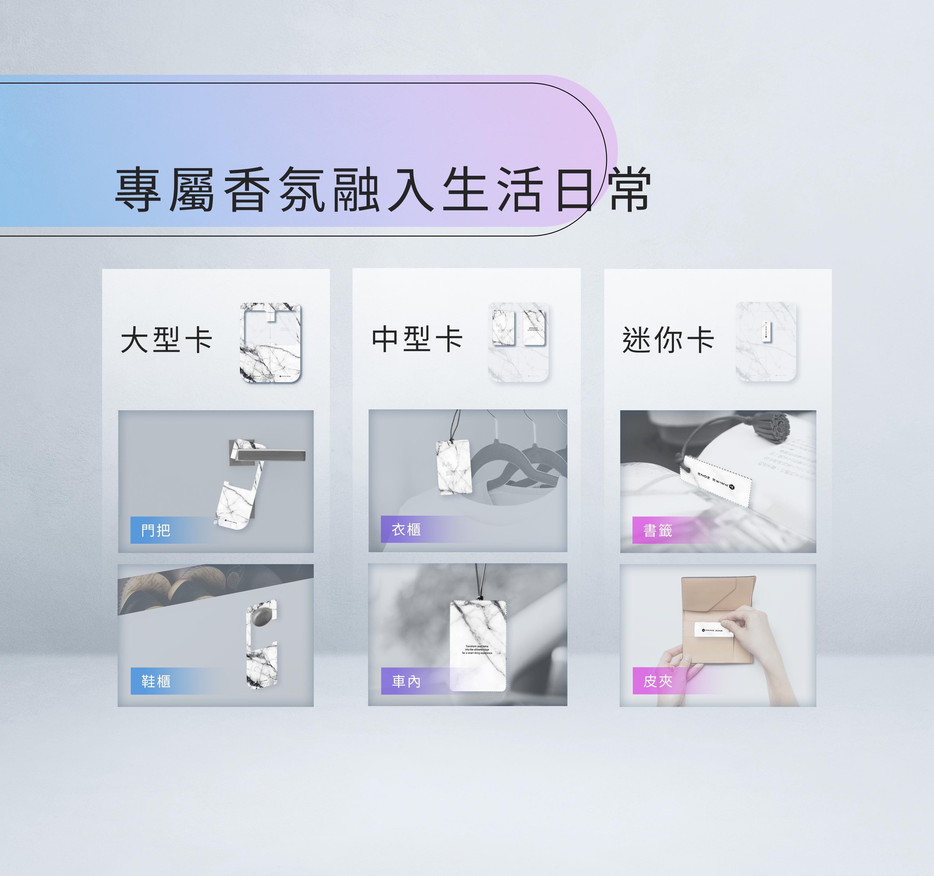 一次列印即可製作各區的香卡,大型卡可掛於空間中;中型卡置於櫥櫃、車內;迷你卡可放置隨身包、或作為書籤,專屬香氛隨身攜帶。