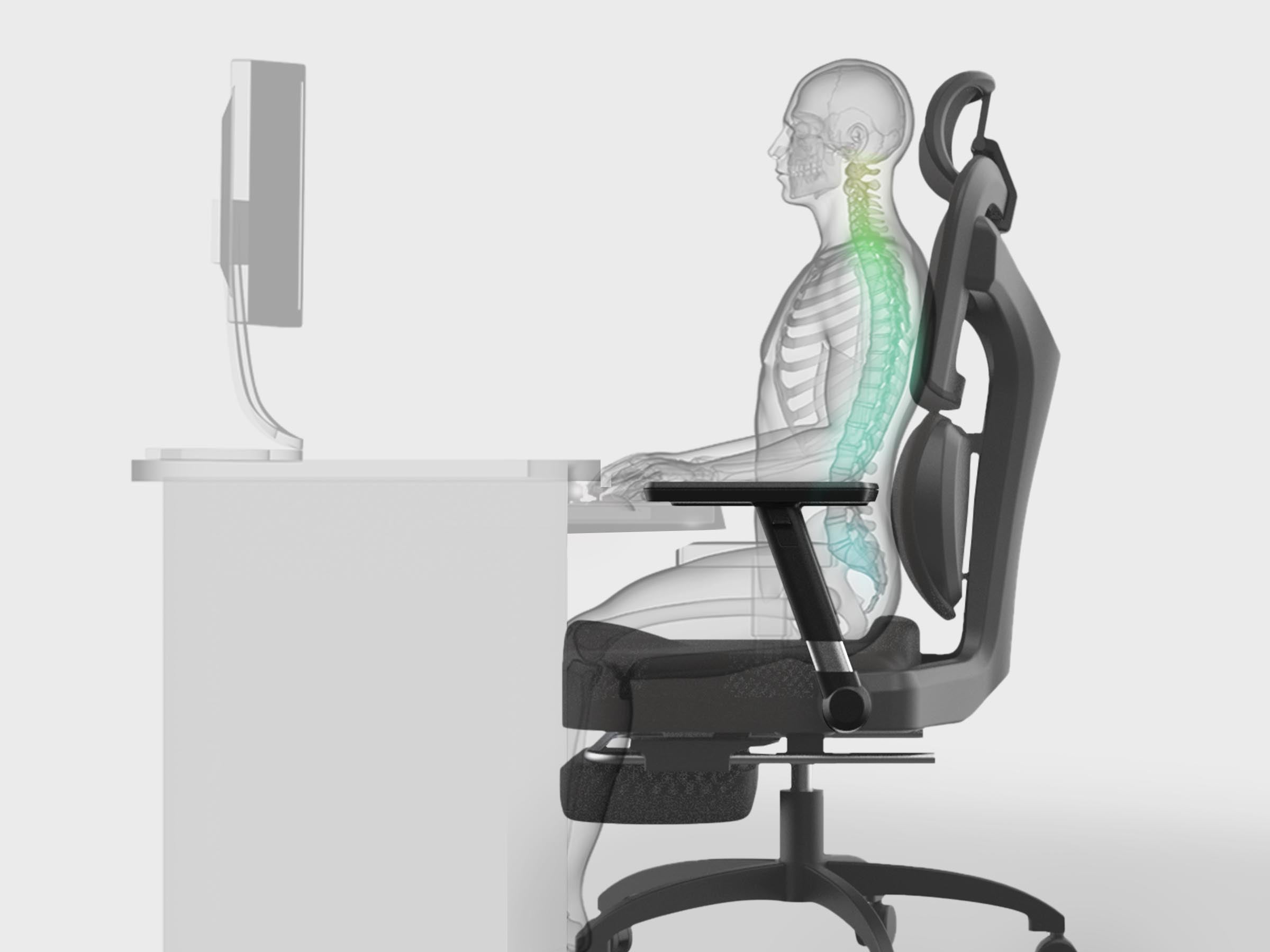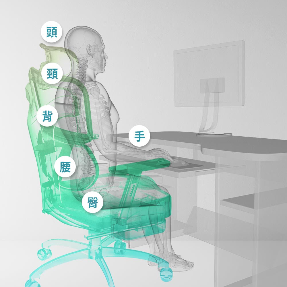 針對過往消費者痛點進行優化,將腰靠、頭靠升級成可調式設計,解決不同坐深、身高差異,真正找到貼合自己身形的人體工學椅,發揮坐姿骨盆正位、脊椎減壓的功能。同時保留大受好評的多功能腳蹬,讓午休仰躺更加舒適,6區減壓結構給予全身最佳支撐。