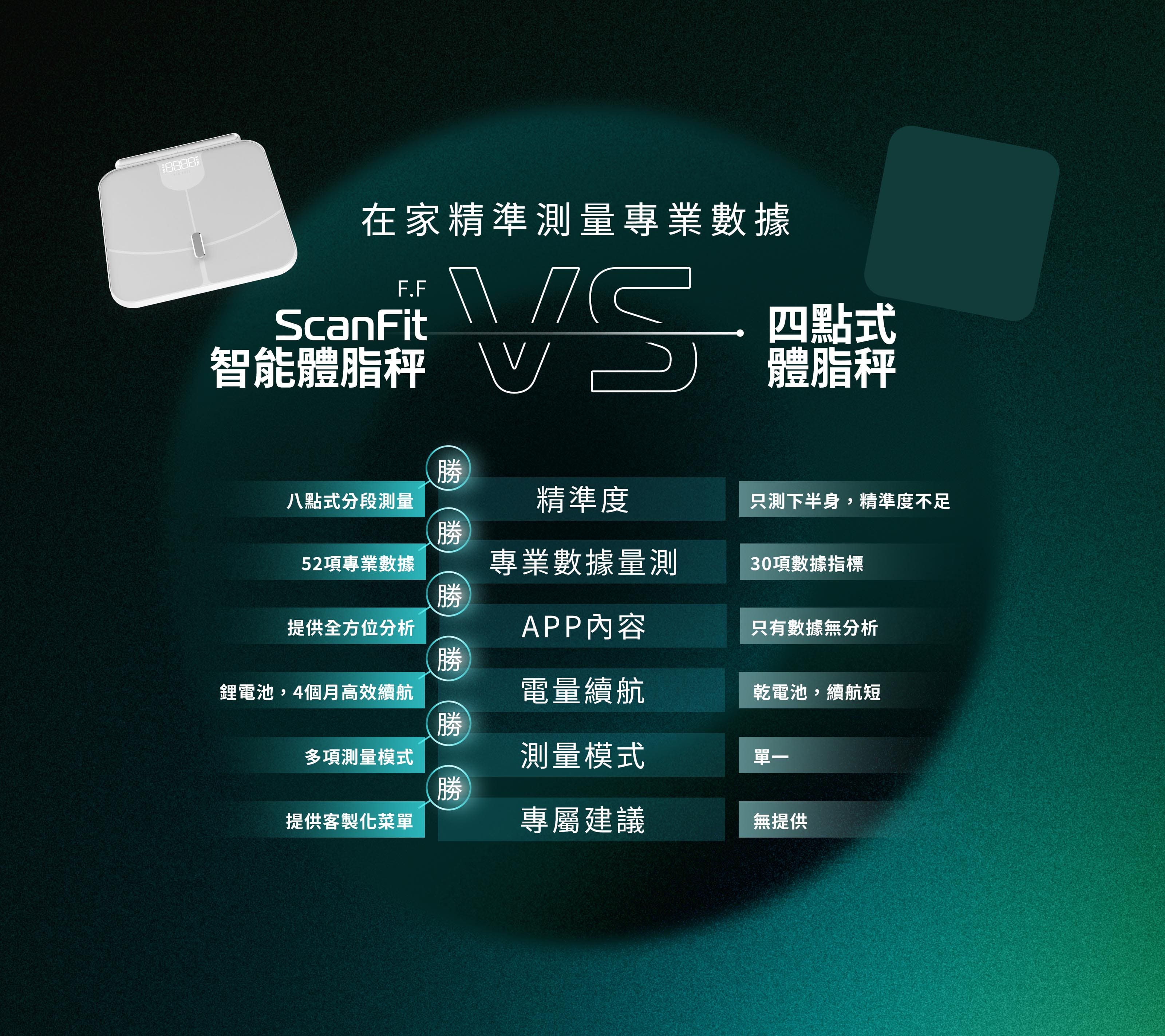 有別於一般腳踩四點式體脂計,八點式利用電極傳導,上下身分段式測量,僅需30秒立刻量出全身精準數據。