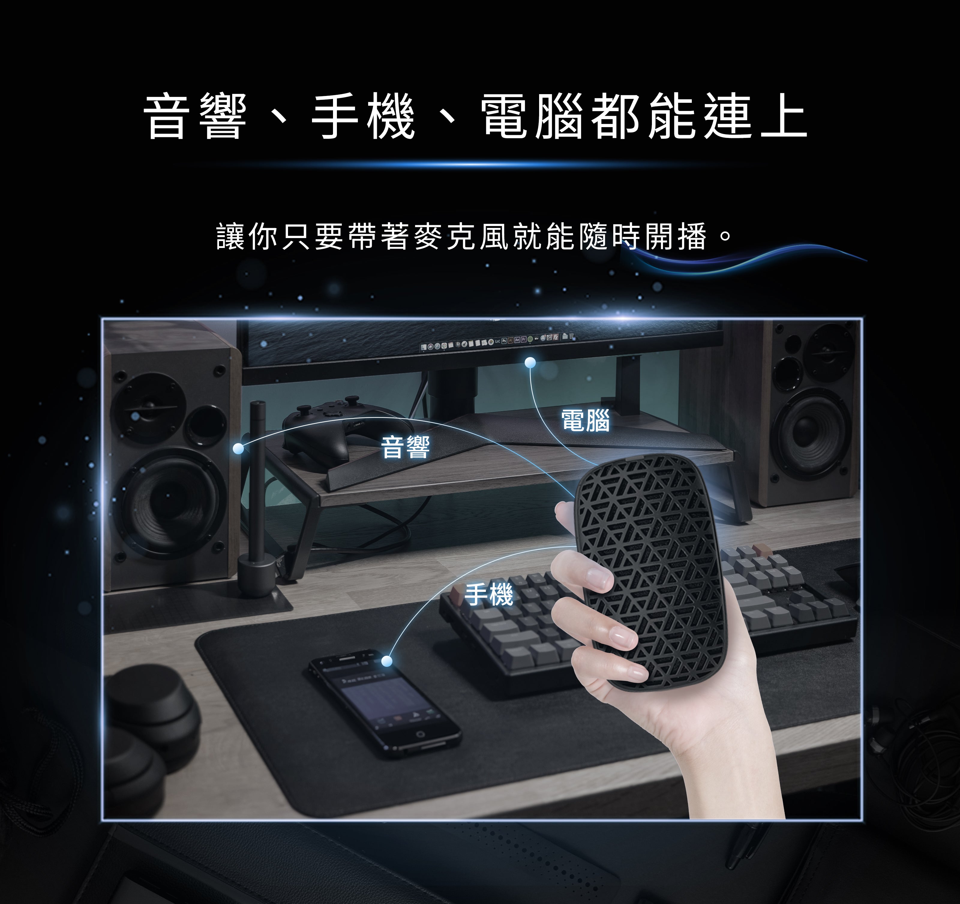 全指向收音,能將麥克風前的人聲完整收錄後清晰傳達,讓你的直播更順暢。