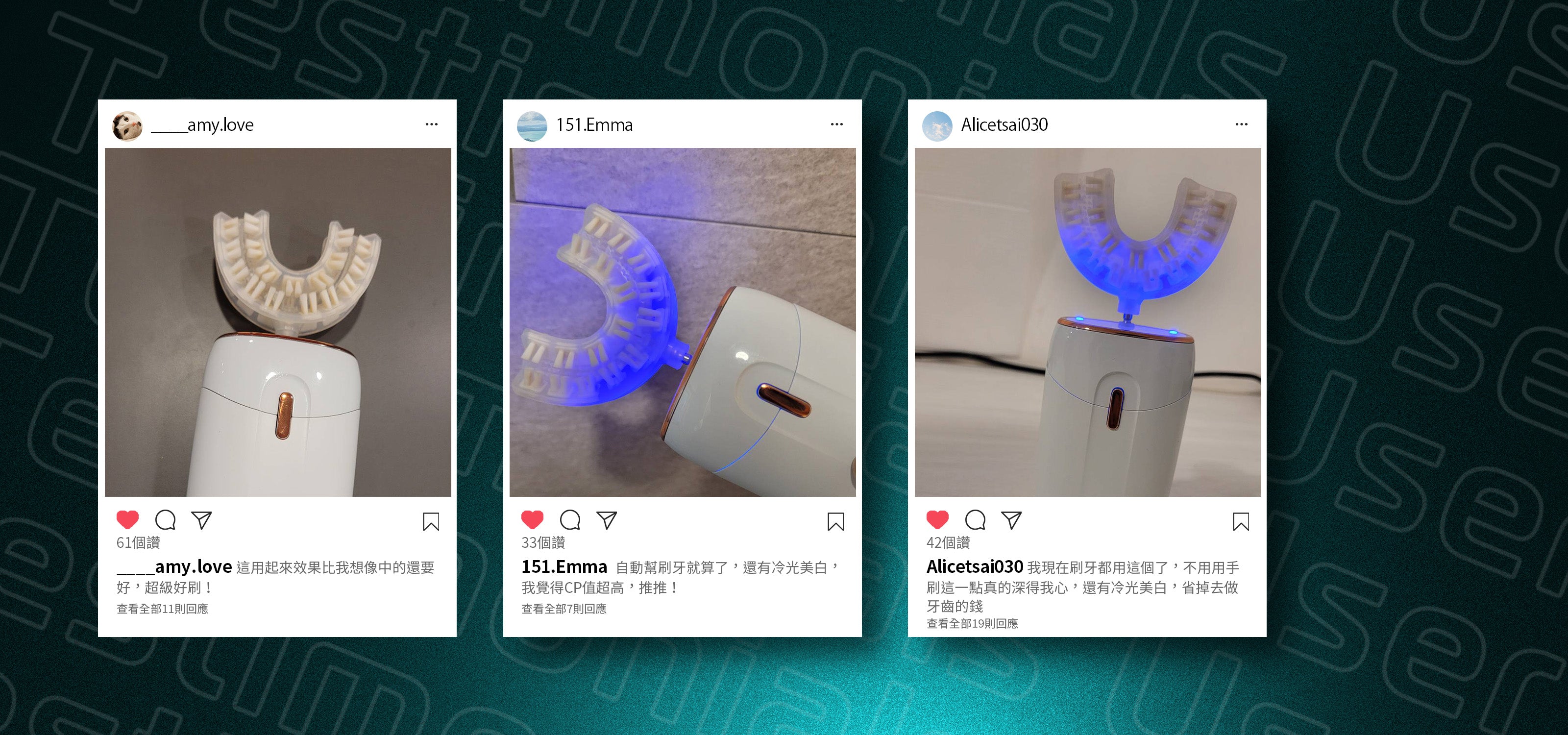 半圓形環狀設計,貼合口腔,前後左右100%全面包覆,任何一個角落跟縫隙都刷得到,改善傳統牙刷刷不乾淨的缺點。